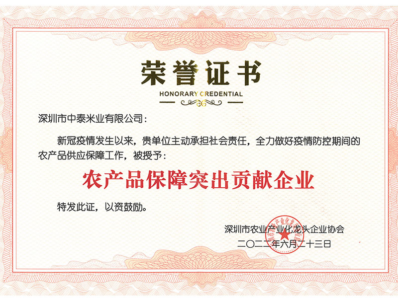 农产品保障突出贡献企业证书